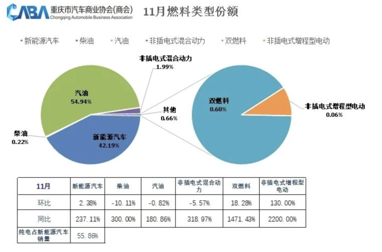 数据显示,11月,重庆市场燃油车销量占比为54.94%,新能源汽车销量占比高达42.19%,新能源渗透率持续攀升。其中,新能源汽车11月销量同比增长237.11%,纯电车型占比达55.86%。