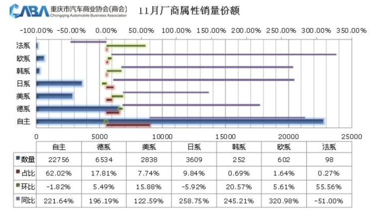 中国品牌、德系品牌、美系品牌、日系品牌都呈现倍增。韩系、欧系、法系单月销量加起来不足千辆,市场占比不到3%。