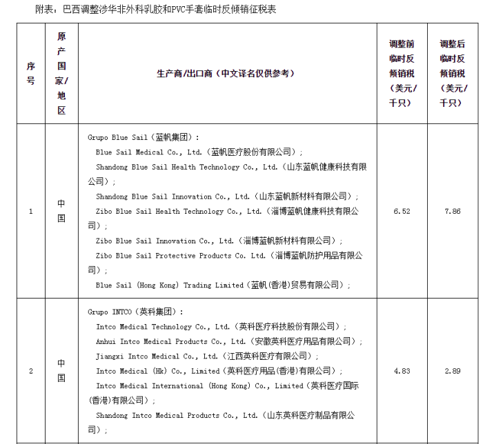 6月14日,巴西外贸委员会管理执行委员会(GECEX)发布2024年第604号决议,调整对原产于中国、马来西亚和泰国的非外科乳胶和PVC手套(葡萄牙语:luvas para procedimentos no cirúrgicos para assistência à saúde, utilizadas em medicina, odontologia e veterinária)的临时反倾销税率,调整后的中国涉案产品的税率为2.89~20.94美元/千只,马来西亚和泰国的涉案产品税率保持不变,分别为15.30~30.17美元/千只和1.38~14.25美元/千只(详细见附表)。涉案产品的南共市税号为4015.12.00、4015.19.00以及3926.20.00。本决议自公布之日起生效。