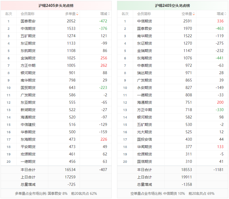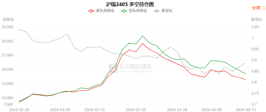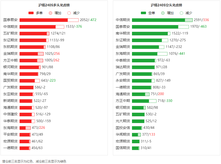 总体而言,沪锡2405合约今日减仓上行,多空持仓排名前20席中,多空双方均呈退场态势,多头退场意愿弱于空头。