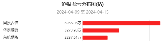 数据显示,一周内国投安信、华泰期货、东航期货在沪锡上盈利居前,三机构分别盈利6956.06万元,3273.93万元,2237.61万元。